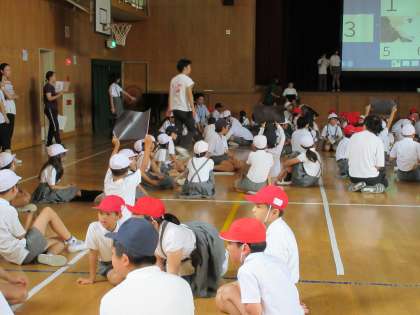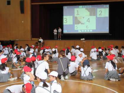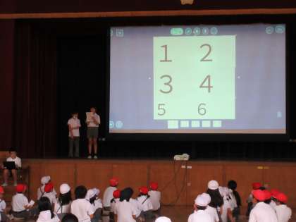 今日の児童集会はたてわり班でキャラクターあてクイズです。