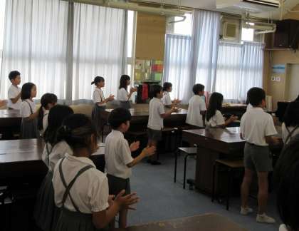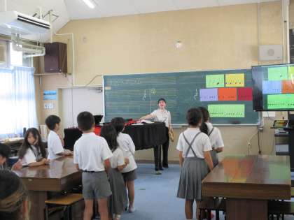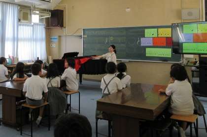 手拍子でリズム打ちをしています。音符を見ながら正確にリズムを刻んでいます。練習を終えると、なんと!とてもテンポの速い、Mrs.GREEN APPLEのライラックの曲に合わせて、リズム打ちに挑戦です。黒板の音符を見ながら、必死で手拍子をしている子どもたちでした。