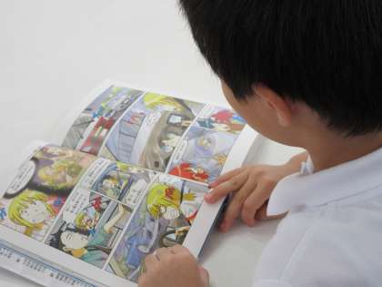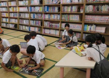 一人静かに読んでいる子や友達といっしょに1冊の本を読んでいる子や、ひたすら本棚の前で本を選んでいる子や様々です。