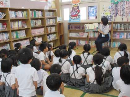 そのあと、図書館司書の成合先生に絵本の読み聞かせをしていただきました。みんな真剣に聞いていますね。