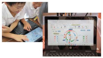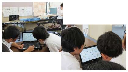 打楽器の音色や音の強弱、音の重なりなどを意識しながら、思い思いの音楽をつくります。端末でアプリに接続して、図形化された楽譜を使って、音を並べながらつくっています。