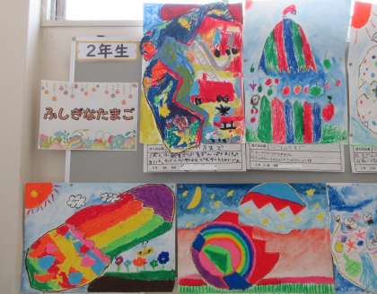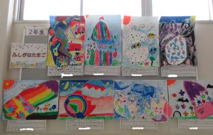 2年生の図画工作科の作品が階段の掲示板に貼られていました。