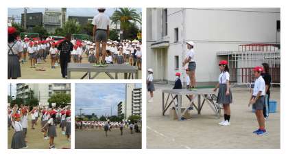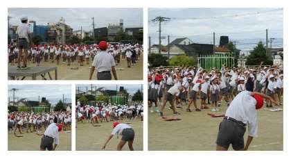 いよいよ来週末は運動会!ということで、今日は全校児童でラジオ体操の練習です。朝礼台の上の児童に合わせて、みんなで音楽に合わせて・・・