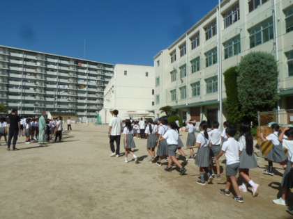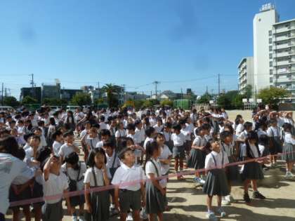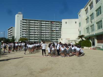 今日はその一つとして、お昼休みを使って全校で写真を撮りました。1年生から6年生の児童、教職員みんなで校舎の上にいるカメラマンさんに向かって、はい、ポーズ!