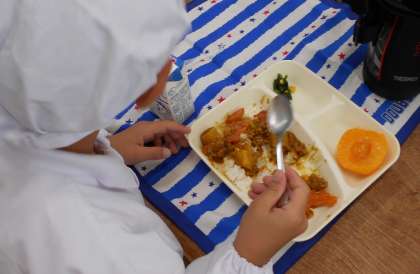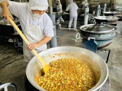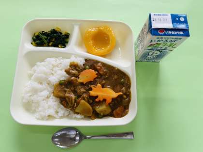 今日の給食のカレーには、ラッキーにんじんが入っていました。運動会を目前にして、しっかり食べてほしいと給食調理員さんも心をこめて給食を作っています。