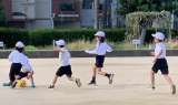一年生が元気に運動場で体育をしています。ボールを蹴るベース型運動につながる動きで...