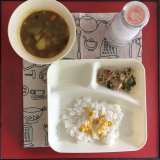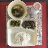 今日の献立は、プルコギ、とうふのスープ、チンゲンサイとコーンの甘酢あえ、ごはん、...