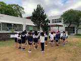 雨が降っていますので、炊飯場で開舎式をしました。今から学級写真を撮って、雨の中、...