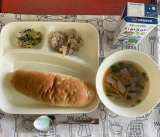 今日の献立は おさつパン 牛乳 鶏肉のからあげ とうがんの中華スープ ツナとチン...