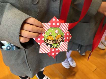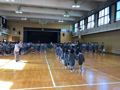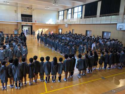 講堂で一年生との対面式を行いました。6年生からの歓迎の言葉と2年生からのプレゼント渡しがありました。最後に1年生が声をそろえて『よろしくお願いします』と言うことができました。どの学年も静かに集まることができ、一年の成長を感じます。