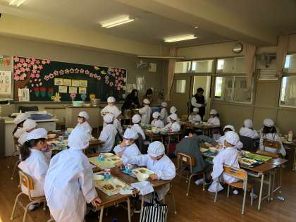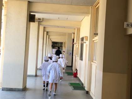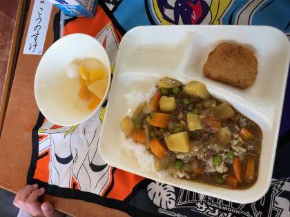 今日から給食がはじまりました。一年生は少し緊張した面持ちで支度をしていました。今日献立はカツカレーライス、フルーツ白玉でした。子どもたちに人気のメニューです。下の写真は2年生の給食当番の様子です。後ろに雑巾を持った人がいます。こぼした時にすぐに拭くためです。用意がいいですね。