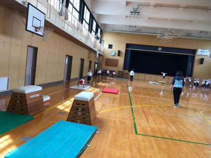1年生がたくさんの器具を使って、体育館いっぱいに使って運動しています。マットや跳び箱、平均台などを約束を守って楽しい活動が活発できていました。楽しみながらいろいろな運動を経験しています。