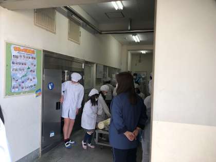 5・6年生の給食委員の人たちが、給食を取りにくる当番の人たちのお世話をしています。みんながいっせいに取りにくるので大忙しです。