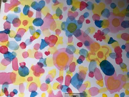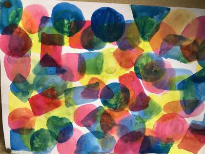 5年生の教室には、色とりどりの丸や四角などの模様を使った絵画を掲示しています。薄い色が重なった部分が違う色になって、本当にきれいです。