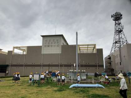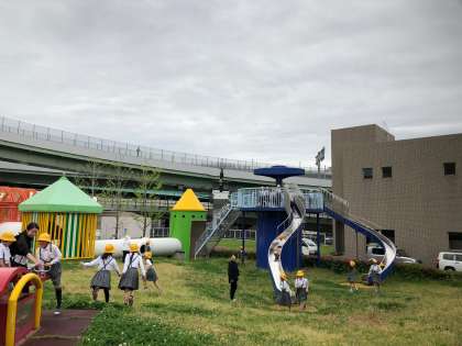 見学の後は広場で遊びました。噴水が出るシーソーやすべり台など、水に親しみながら、元気いっぱいに遊びました。お天気も曇りですが、雨が降らなくて本当によかったです。