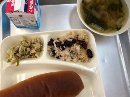 今日の給食の献立は、金時豆の中華おこわ、中華スープ、ツナと野菜のオイスターソース炒め、パン、牛乳でした。昔、もち米を蒸した飯を「強飯(こわいい)」と言い、それに丁寧語の「お」をつけて短くて「おこわ」という名前になったそうです。ふっくらとした金時豆とおこわが味わい深く、たくさんの野菜の入った中華スープとよく合っていました。ツナと野菜のオイスターソース炒めもおいしかったです。