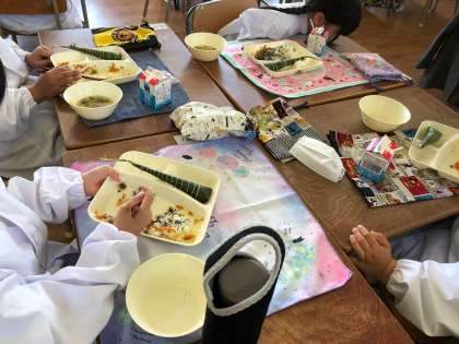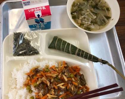 今日の給食の献立は、牛肉のちらし寿司、すまし汁、ちまき、ご飯、牛乳でした。こどもの日の行事献立で、「ちまき」がついています。「ちまき」には、「子どもが元気で大きくなりますように」という願いが込められています。ちらし寿司には、甘辛い牛肉と歯ごたえのあるたけのこや柔らかいニンジン、グリンピースがいい味わいを出していて、お出汁のきいたすまし汁との相性も抜群です。ちまきは子どもたちに大人気でした。