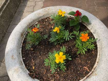 玄関にあるプランターには、管理作業員さんの手で夏の花が植えられました。