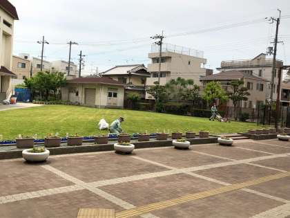 管理作業員さんの手で、芝生が緑に復活です。草のにおいもして、本当に気持ちいいです。