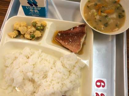 今日の給食の献立は、あかうおのしょうゆだれかけ、みそ汁、えんどうの卵とじ、ご飯、牛乳でした。あかうおは脂が乗っているのに、ぷりぷりした歯ごたえがあり、ご飯によく合いました。えんどうも生のものを使っていて、出汁のきいた優しい味わいでした。みそ汁にはたくさんの具が入っていて、食べ応えがありました。給食室の入り口には季節の花を添えた献立の掲示があります。