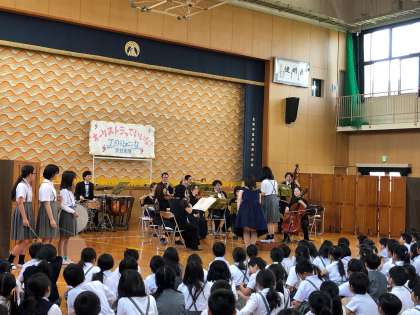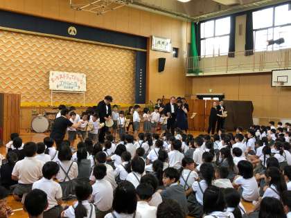 楽器の紹介などの後、みんなで「ビリーブ」を歌ったり、低学年は「おもちゃの交響曲」で楽器を演奏するのに参加しました。高学年は6年生が「ラデツキー行進曲」の指揮を体験させていただきました。「とても緊張しました」という感想を聞きました。音楽でみんなが一つになるというすばらしい体験をしました。