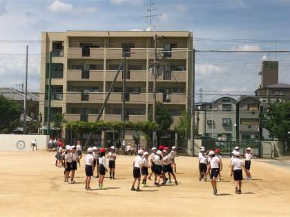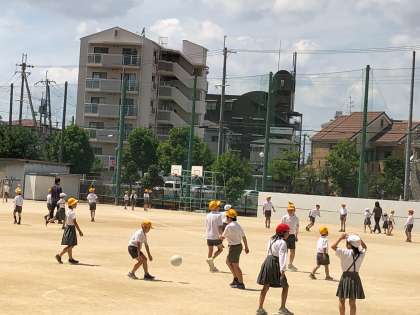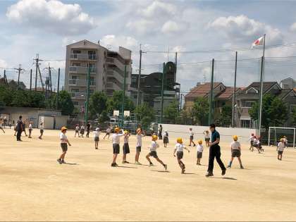 今日もいい天気です。昼休みにはたくさんの子どもたちと先生が一緒に楽しそうに遊んでいます。それにしても手つなぎ鬼で3人で追いかけて、タッチするのは大変そうです。