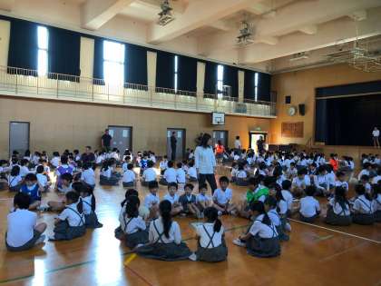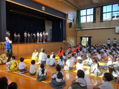 今朝の児童集会は、ゴロピカゲームでした。みんなで輪になって、ゴロゴロと言われたときは、右側に、ピカピカというときは左にボールを回します。ドカンといわれたときにボールを持っていた人は、自己紹介をします。簡単なゲームですが、なぜか盛り上がって、楽しいひとときを過ごしました。