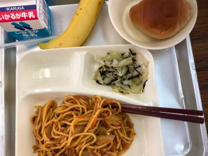今日の給食の献立は、カレースパゲッティ、キャベツのひじきドレッシング、バナナ、パン、牛乳でした。カレースパゲッティはカレーの香りが高く、ニンジンや玉ねぎ、ひき肉などがバランスよく入っていました。キャベツのひじきドレッシングはさっぱりとしていて、食欲を増進させる味わいでした。ひじきも入っていて、食べやすかったです。バナナはよく熟していました。バナナには主にエネルギーのもととなる炭水化物の他に、カリウムや食物繊維などが豊富に含まれているそうです。