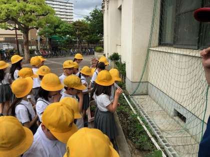4年生が観察しているのは、ひょうたんの苗です。大きさをものさしではかっています。大きくなってきました。