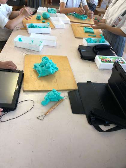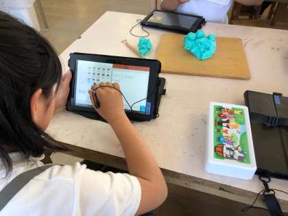 6年生がタブレットパソコンを使って、アニメーションを作っていました。粘土でできた形を少しずつ変形させて写真に撮って、それを連続して構成すると動いているように見えます。なかなかの力作ができていました。