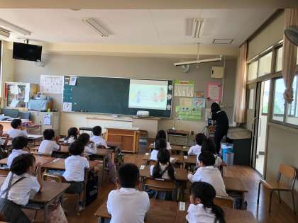 掃除の後は金曜日のE-タイムです。シェーン先生の放送での読み聞かせに合わせて、スクリーンに映された絵本のページをめくっていきます。そのあとクイズがありますが、英語で聞かれたクイズに、英語で答えられる1年生もいました。