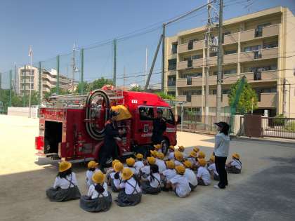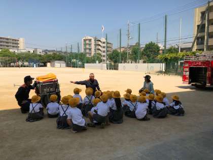 順番に学級ごとに消防自動車や消火活動の説明を聞いています。