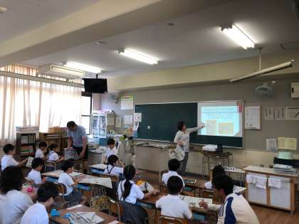 同じく3時間目に、1・2年生は新聞紙のスリッパづくりを教室で行っています。地震などの災害のときに役立つので、知っておくと便利です。たくさんの保護者の方々も参観してくださっています。