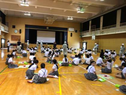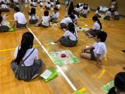 5・6年生は講堂で普通救命教室を行っています。1分間に100回のリズムで心臓を圧迫するために、ウサギとカメの歌を歌います。みんな上手にできるかな?
