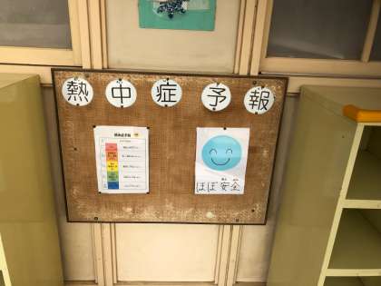 今日は少し涼しいですが、これから暑くなってきます。保健室前や職員室などに、暑さ指数の掲示をしています。子どもたちにも意識してもらうために、工夫しています。