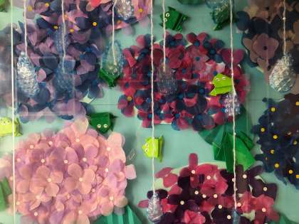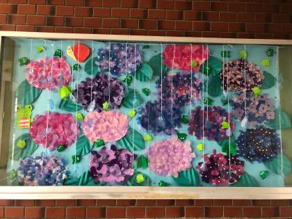 6月に入りました。玄関の掲示がアジサイとカエル、雨の模様に変わりました。半透明のアジサイの花とかわいいカエル、透明の水滴がとても鮮やかで涼しげです。4年生の作品です。
