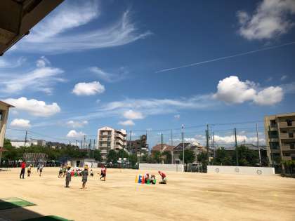 6年生が、きれいに晴れた空の下、リレーのタイムを計っていました。「がんばれ!」「リード、リード」と励まし合う声かけが運動場に響いていました。