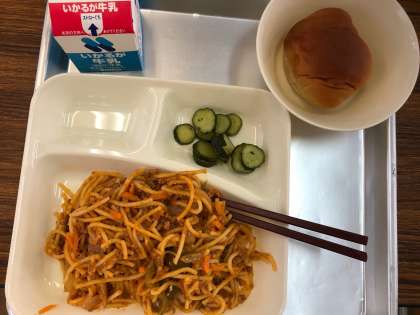 今日の給食の献立は、スパゲッティミートソース、きゅうりのバジル風味サラダ、パン、牛乳でした。ひき肉がたくさん入ったミートソースは、ケチャップやトマトピューレ、ウスターソースがちょうどよくスパゲッティにからんでいて、食欲をそそるおいしさでした。きゅうりにはワインビネガーやバジルの香りがついていて、あっさりと食べられました。