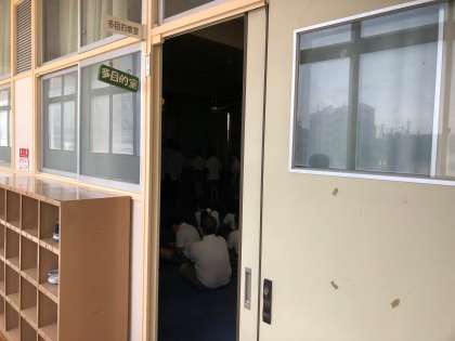 多目的室の前にたくさんの上靴が並んでいます。子どもたちが検診を受けています。暗くしてあるので、みんな静かに並んで座って待っています。