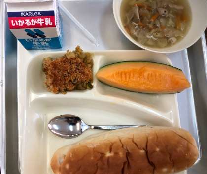 今日の給食の献立は、カレードリア、スープらクインシーメロン、パン、牛乳でした。カレードリアはトッピングのチーズやパン粉がかりかりに焼かれていて、カレーの香りも高く、子どもたちにも人気でした。スープにはたくさんの野菜が入っていて、柔らかく優しい味わいでした。クインシーメロンはよく熟していて、大変ジューシーでした。パンはさつまいもパンで、ほんのり甘く、とても柔らかくて食べやすかったです。