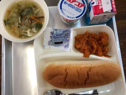 今日の給食の献立は、えびのチリソース、中華スープ、ヨーグルト、ブルーベリージャム、パン、牛乳でした。えびのチリソースは辛すぎず、豆板醤や生姜の香り高い本格的な味わいでした。中華スープには、焼き豚、キャベツ、チンゲンサイなどの具がたくさん入っていて、食べ応えがありました。特にたけのこやもやしの食感がいいアクセントになっていました。ヨーグルトやブルーベリージャムもついていて、楽しい献立でした。