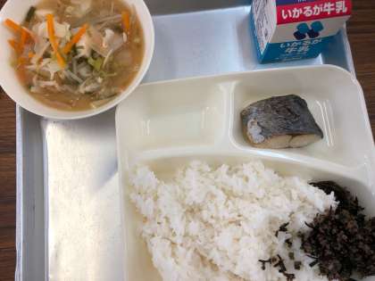 今日の給食の献立は、さごしの塩焼き、みそ汁、牛ひじきそぼろ、ご飯、牛乳でした。さごしの塩焼きはあっさりとした塩味に仕上がっていて、箸でほぐれるさごしのおいしさが引き立っていました。みそ汁にはとうふや野菜がたっぷり入っていました。なんと5種類もの野菜がとれて栄養もたっぷりでした。牛ひじきそぼろに入っているひじきには鉄分だけでなく、カルシウムや食物繊維、マグネシウムなどもたくさん含まれています。栄養豊富なひじきが牛ひき肉と和えてあって子どもたちの口に合う味つけになっています。