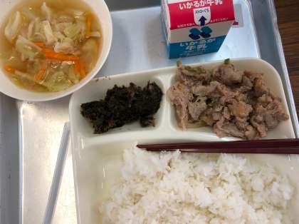 今日の給食の献立は、豚肉のごまみそ焼き、すまし汁、海苔の佃煮、ご飯、牛乳でした。豚肉には味噌や練りごまなどの味つけがよく染み込んでいておいしかったです。すまし汁はだしがよくきいていて、キャベツやたけのこの食感が楽しめました。海苔の佃煮は、風味よく仕上げられていて、ご飯がどんどん進む献立でした。
