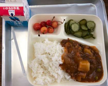 今日の給食の献立は、ハヤシライス(ご飯)、きゅうりのサラダ、さくらんぼ、牛乳でした。まず、全体を見たときのいろどりのコントラストが素敵な献立です。ハヤシライスの茶色の中に、グリンピースの緑、さくらんぼの赤と色とりどりです。ハヤシライスには柔らかくしかも形の崩れていないほくほくのじゃがいも、とろけそうなたまねぎ、オレンジ色のにんじん。トマトピューレとケチャップ、いろいろなソースの入った味わい深い風味でした。きゅうりのサラダはさっぱりとしたワインビネガーで上品な味わいでした。さくらんぼが甘くてフレッシュな後味でした。