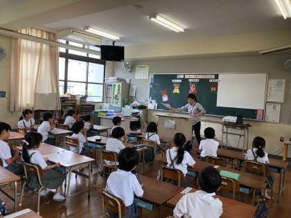 栄養教諭の先生に来ていただいて、今日は1年に食べ物の役割についての学習です。3匹の子グマが出てきます。ご飯と魚と野菜を苦手な子グマが、先生の言葉から、がんばって食べるようになります。クイズでは、さっき聞いたお話を思い出しながら、答えていました。楽しみながら、栄養について学習していました。