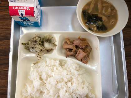 今日の給食の献立は、鶏肉の甘辛焼き、味噌汁、キャベツの赤じそあえ、ご飯、牛乳でした。鶏肉は焼き物機でジューシーに焼かれていて、たまねぎの風味がアクセントになっていました。味噌汁にはかぼちゃやオクラわかめと薄揚げが入っていて、出汁もよくきいていました。キャベツの赤じそあえは、さっぱりとした口あたりでしその香りが食欲をそそります。