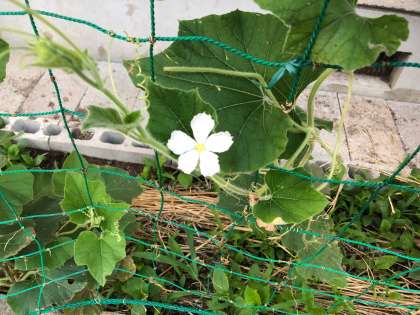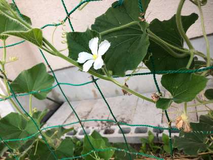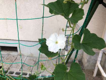 夕方、4年生が植えているひょうたんに雌花が咲いていました。上の2枚が雌花です。3枚目の雄花に比べるとずいぶんおとなしい感じです。雌花には根元に膨らみがあって、そこが実になります。