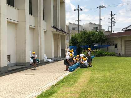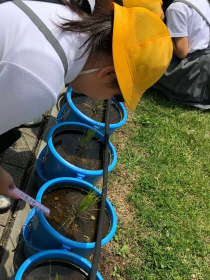5年生が芝生のところのバケツ稲の観察をしていました。長さをはかったり、タブレットパソコンで写真を撮ったりして、毎週記録しています。きっと観察結果をまとめるのも発表するのも、タブレットパソコンなどを活用することでしょう。子どもたちどうしの話し合いにも活用しています。