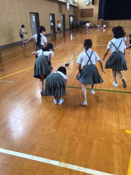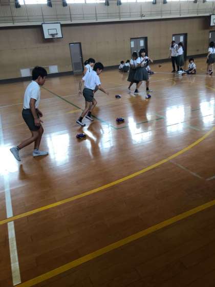 理科の学習「電気のはたらき」でモーターカーを作りました。直列つなぎや並列つなぎを知り、どのようにつなげたら早く走るのかを考えて、それぞれが試走しています!