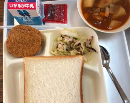 今日の給食の献立は、チキンレバーカツ、タコとキャベツのソテー、ケチャップ煮パン、牛乳でした。チキンレバーカツはからりと揚げられていて臭みもなく食べやすかったです。タコとキャベツも塩胡椒であっさりと仕上げられていましたケチャップ煮は、野菜がたくさん入っていて栄養たっぷりの献立でした。